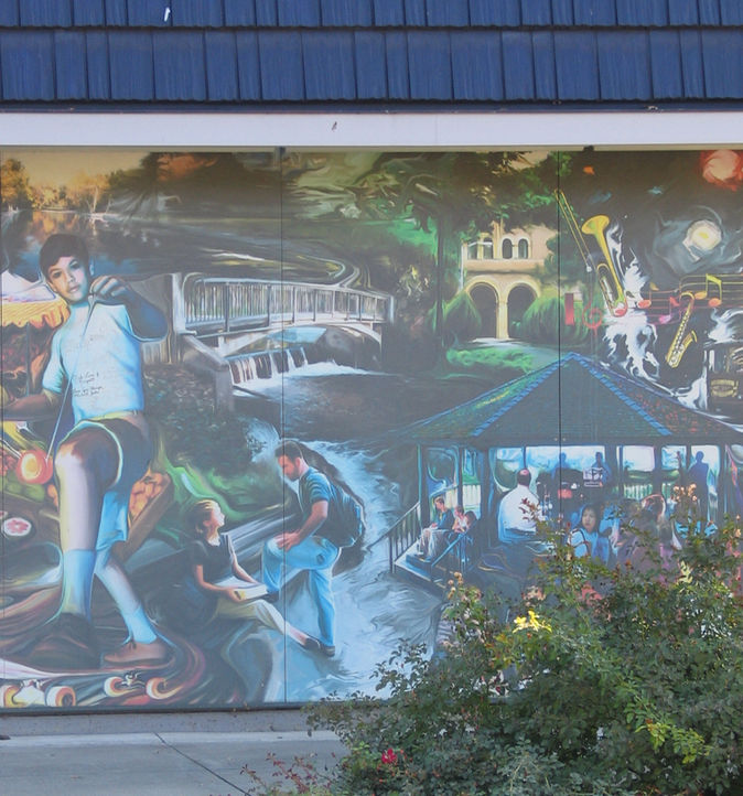 Using the newest technology, the artist created a mural using digitally painted photographs of downtown landmarks and events. The mural located in Chico, California serves as a warm welcome to travelers entering the city through the Esplanade. The piece is best viewed from a car or across the street at the Children's Park and features the City of Chico, City of Roses crest.