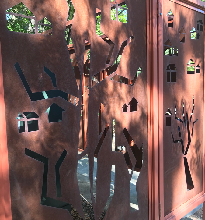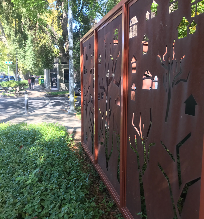 This artist created a series of screens located near the Our Hands sculpture in Chico, California. The screens were designed to reference the close proximity of the Our Hands sculpture and were created by replicating the dominant graphics found in the metal structure. The screens were privately funded by Pacific Gas & Electric Company to meet a request by the City to cover large utility boxes at City Hall. The artist's work can also be seen in various other locations such as the Manzanita Corridor Project, the Bicycle Arches, the Downtown City Plaza, and throughout Sierra Nevada Brewery's decorative work.